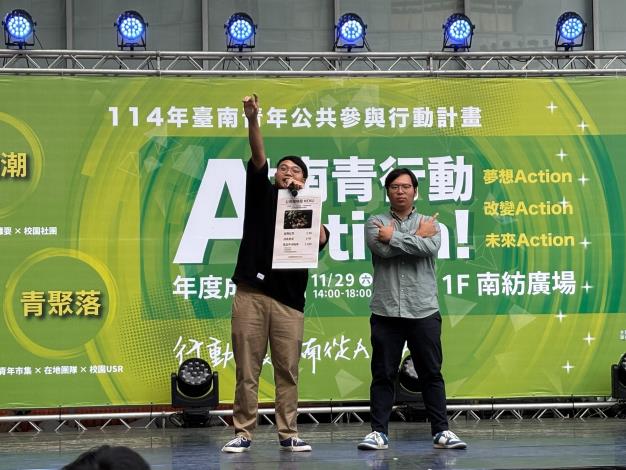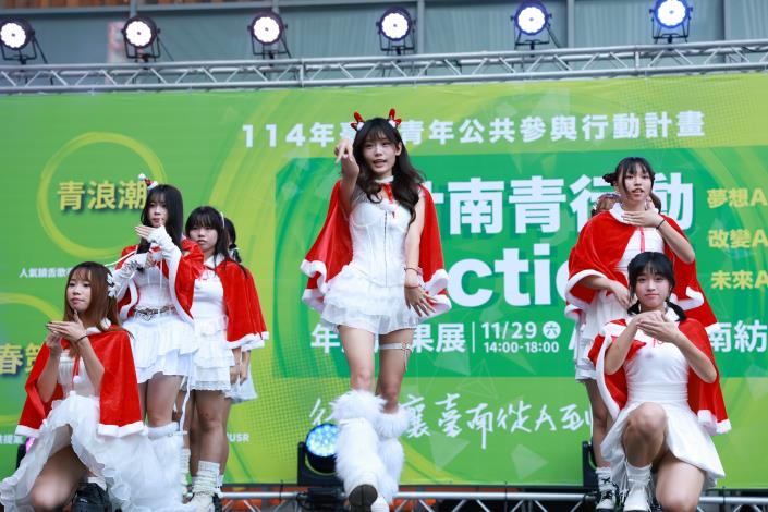 臺南市政府持續推動青年公共參與,打造多元友善的青年發聲平台。由研考會辦理的「114年青年公共參與成果展」昨(29)日在南紡購物中心A2館1樓熱鬧登場,從炫目的舞台演出、年輕氣息濃厚的市集攤位,到大專社團的熱力展演與行動成果展示,讓市民一走進南紡便能即刻感受到臺南青年帶來的城市新動能。